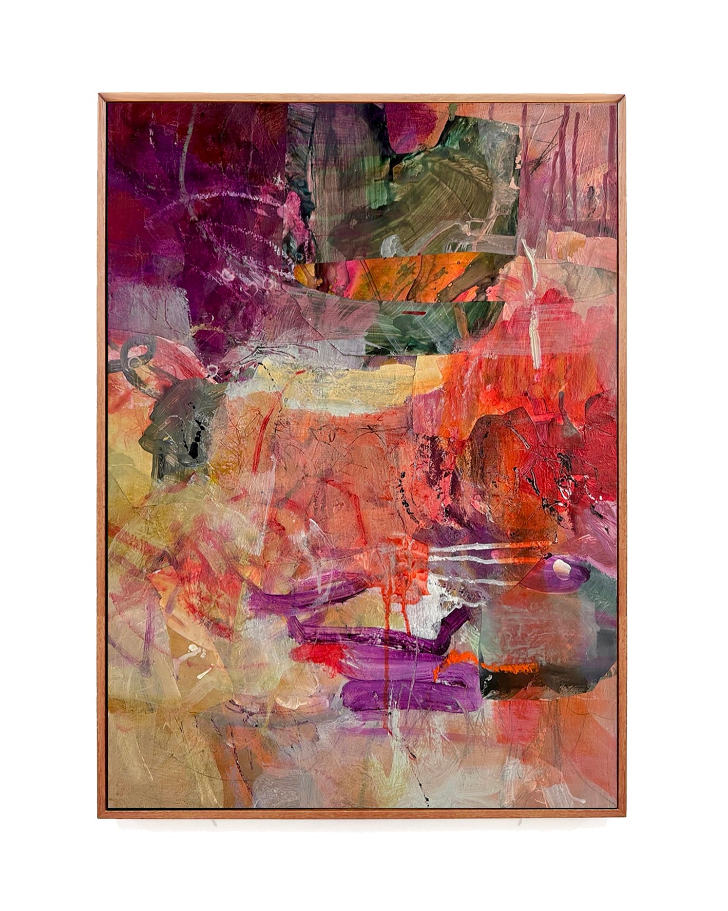 This abstract painting combines bold reds, purples, and greens in a layered, textured composition that evokes both chaos and introspection. The interplay between organic shapes and sharp lines reflects the tension between control and spontaneity, inviting the viewer to explore hidden emotions beneath the surface. It serves as a metaphor for the complexity of human experience, where structure and fluidity coexist.