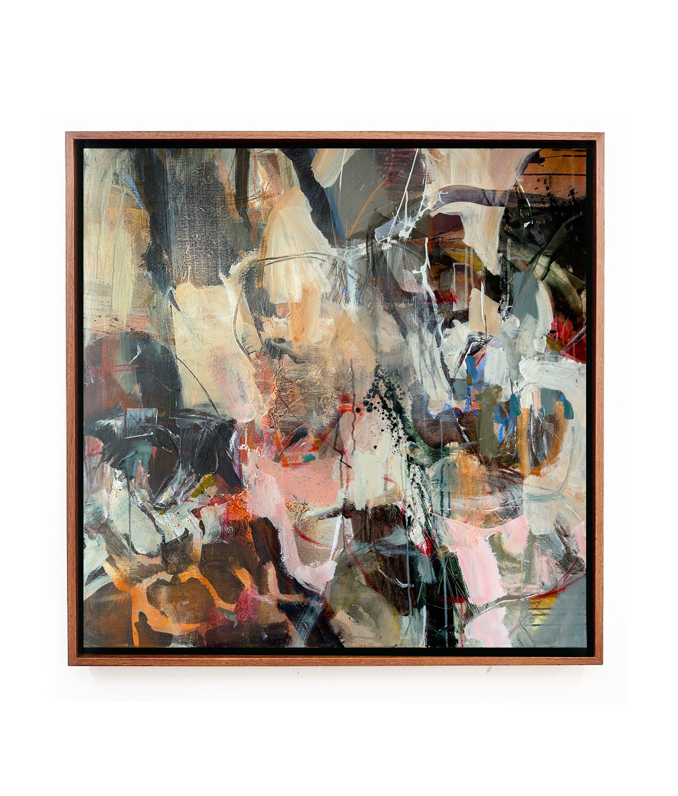This is an original abstract artwork by Anna Rolskaya. It features a blend of earthy neutrals, soft pinks, and vibrant pops of orange and green. The loose brushwork and rich textures evoke an organic flow with an urban edge, combining nature with modern energy. This piece makes a bold yet refined statement for any contemporary space.