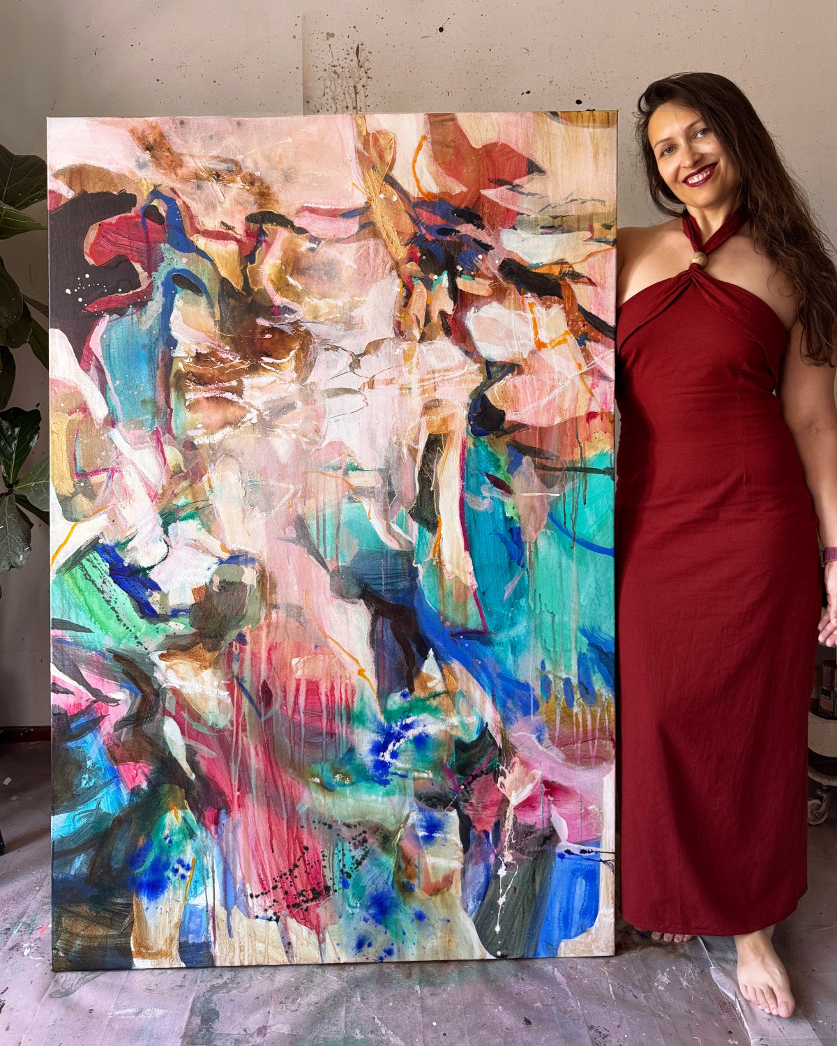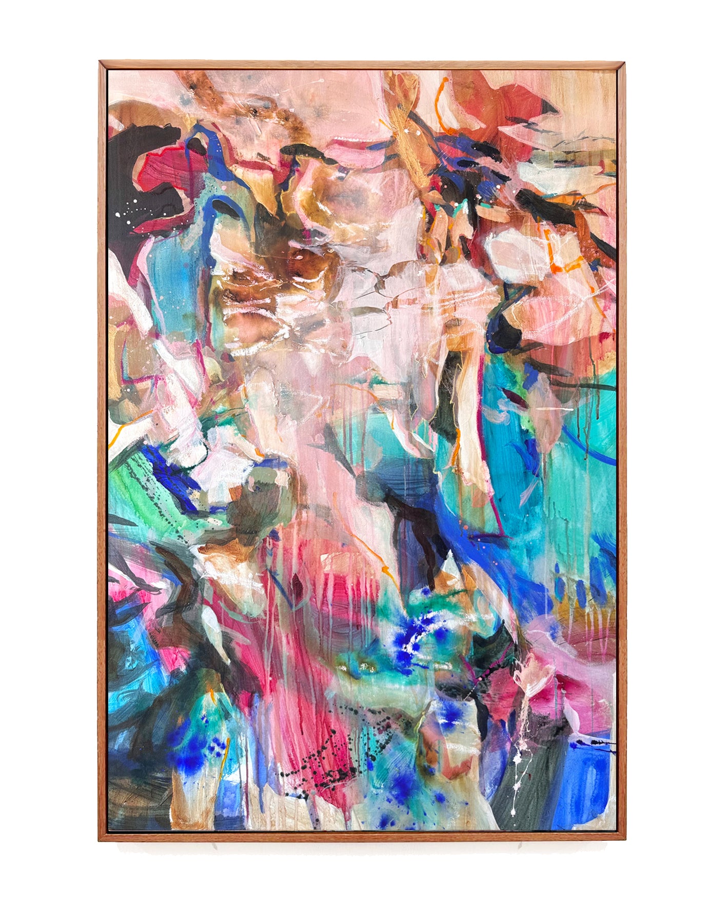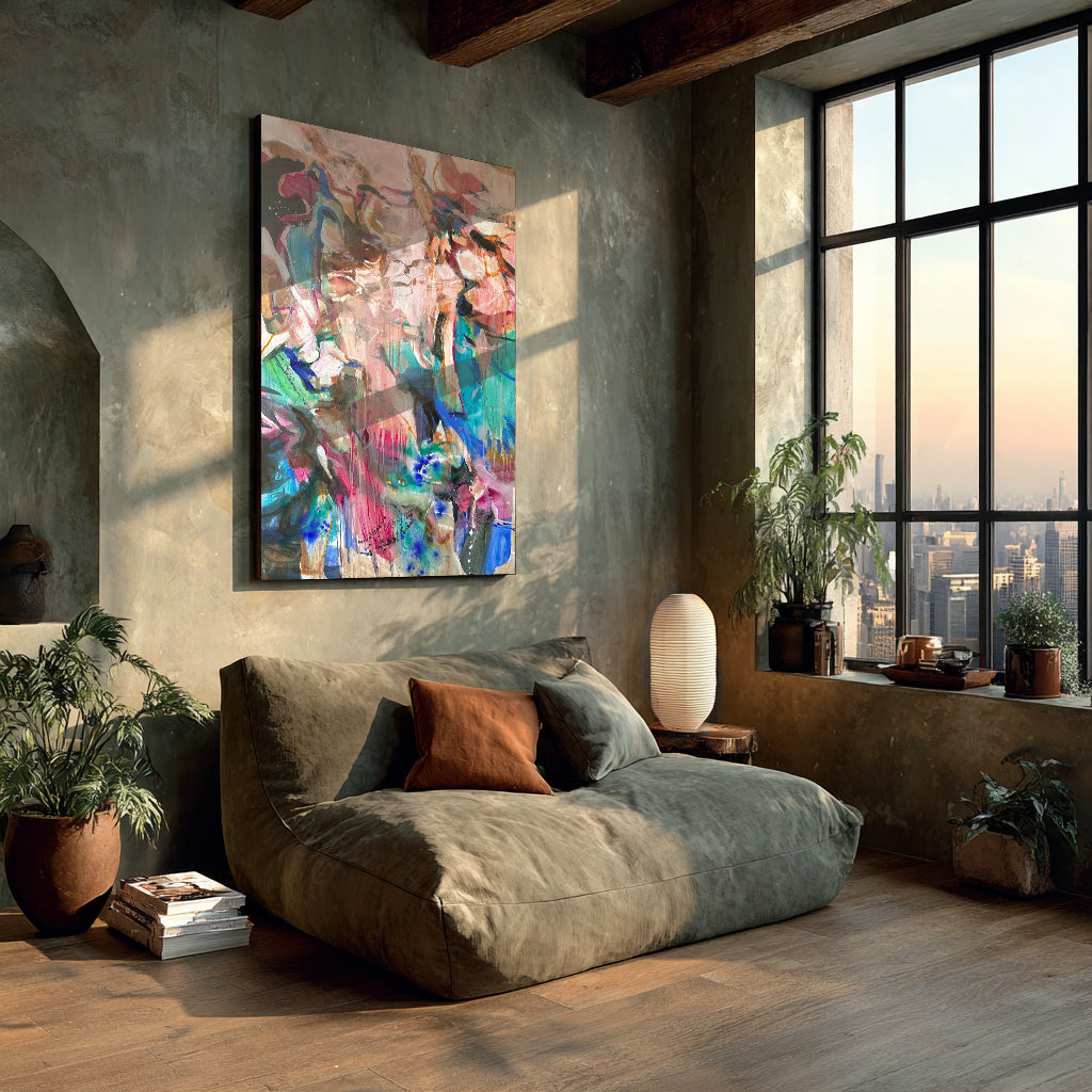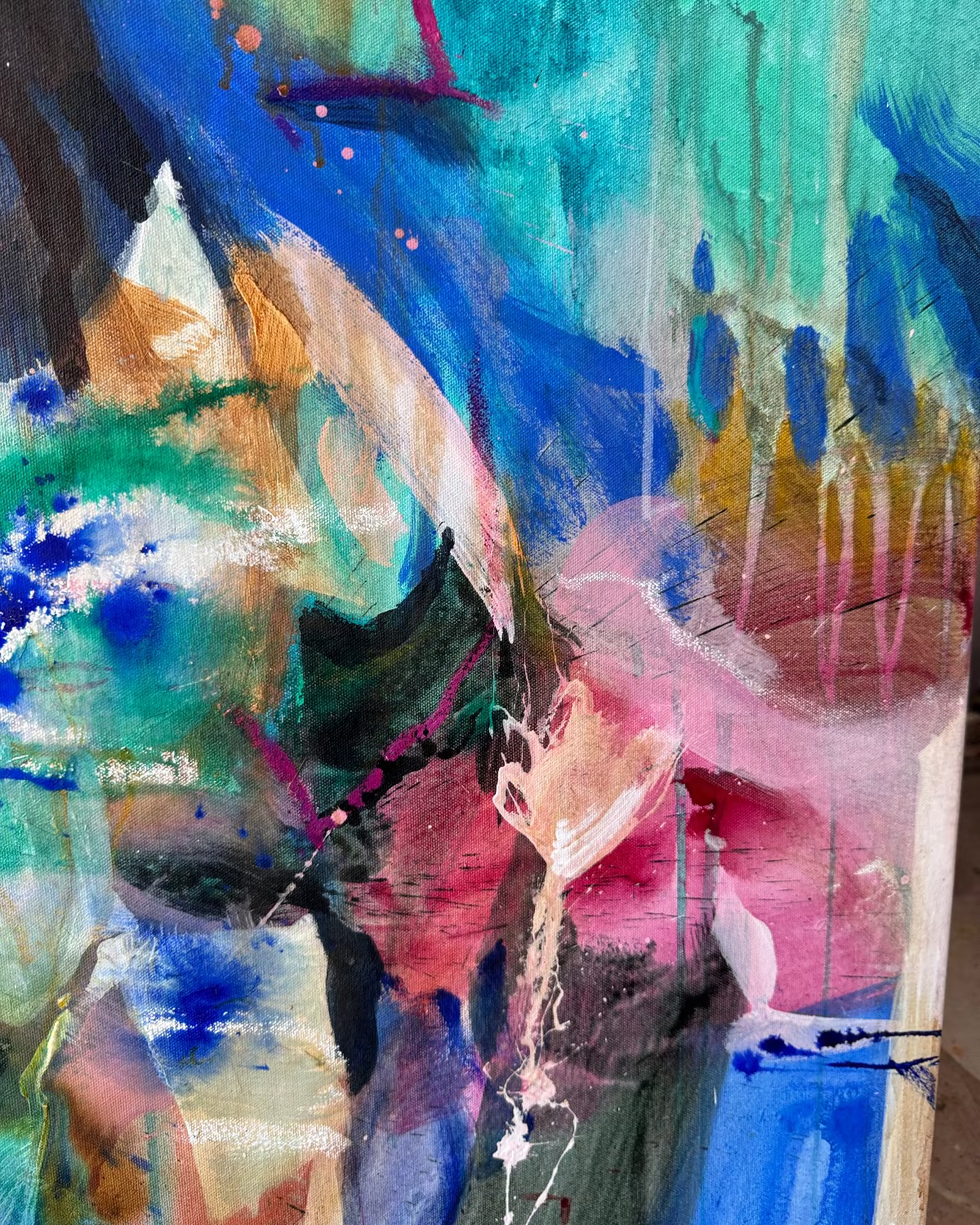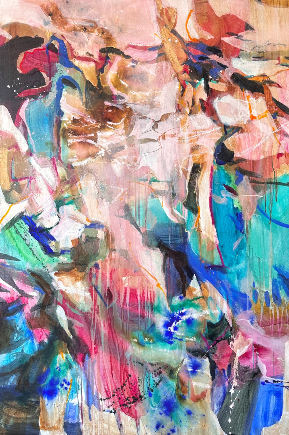 Vibrant abstract composition layered with sweeping gestures, drips, and luminous color contrasts. Shades of turquoise, coral, pink, and deep blue interplay with earthy tones, creating an energetic yet harmonious balance.