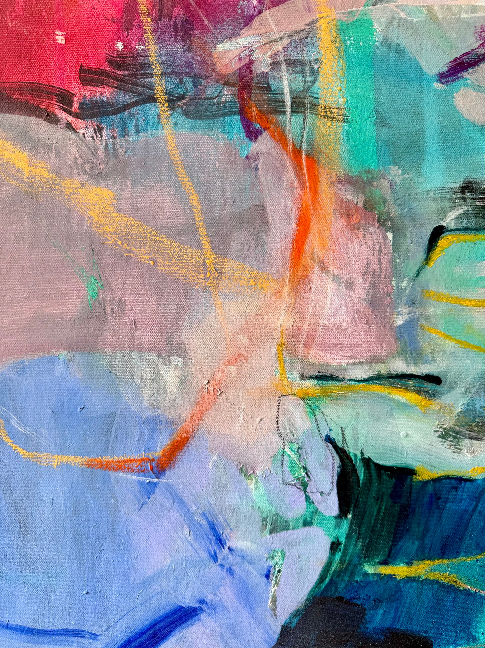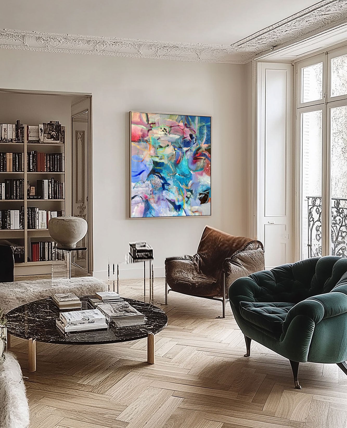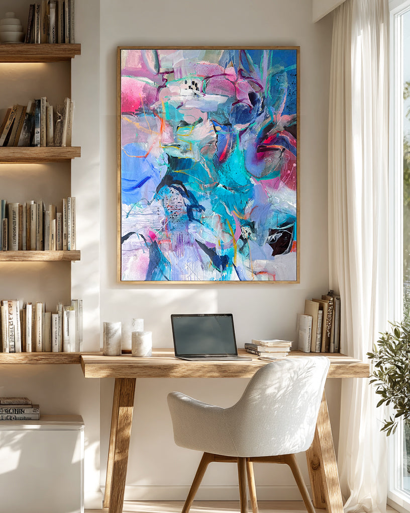Like a wild garden blooming in a dream, this painting sways between mystery and light—lush violets and deep blues whisper secrets over fields of golden breath. Each brushstroke dances with emotion, like wind tracing the memory of someone you once loved. Let this piece live with you, fill your space with its quiet intensity, and remind you daily that beauty thrives in the in-between.