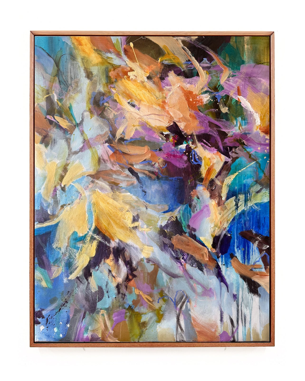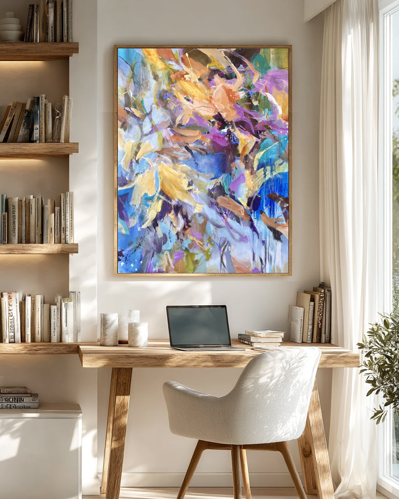 Like a wild garden blooming in a dream, this painting sways between mystery and light—lush violets and deep blues whisper secrets over fields of golden breath. Each brushstroke dances with emotion, like wind tracing the memory of someone you once loved. Let this piece live with you, fill your space with its quiet intensity, and remind you daily that beauty thrives in the in-between.