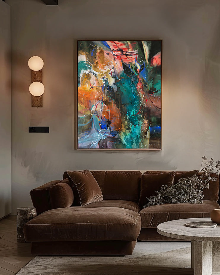 A painting shaped by longing and quiet intensity. Deep tones and flashes of light move through the composition like fragments of emotion—restless, layered, tender. It speaks to distance and connection, to the way absence can shimmer with presence. A piece for those who’ve ever felt something deeply, even in silence.